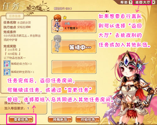 在汲取了玩家意见和建议的基础上,MM官方工作人员加班加点,对战斗房间进行了全面改造——原先,每一个任务结束后,队内成员领取了任务奖励,便会自动返回战斗大厅,相当于这一支队伍一下子就自动解散了;那么现在,一支队伍在完成了一个任务后,将会从战斗场景返回到该任务房间,这时,大家可以选择是“变更任务”,以原班人马向新的任务发起挑战;还是自行离队,“返回大厅”。战斗队伍“自动解散”的现象,从今天起,就不会再出现啦!