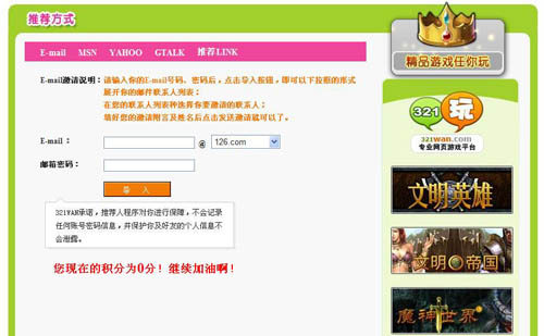 通过E-mail和MSN邀请好友,即使好友不注册321玩平台账号也可以获得积分哦!!