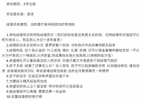 结婚系统期待大调查活动展开后,玩家参与热情高昂。每一个跟帖的玩家都详细写下了自己对结婚系统的期待或猜想。他们的很多猜想很切实的吻合了《牧场OnWeb》本次结婚系统版本的功能内容,当然也还有一些独到的功能暂时还没有人提到。