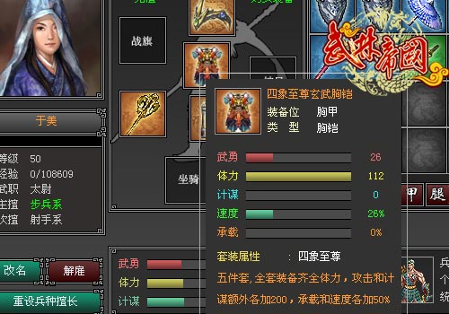 然后就是武将装备的变化,装备的增强以及套装的出现,让玩家的玩法变的更加丰富,这也正如历史上的名将一样,名将本身自然是武功盖世,谋略过人,但是必定也要有好的装备才能完全发挥出威力;全新的套装概念,在收集到整套装备后将获得额外的加成,更是为游戏添加了新的乐趣~试想下自己的爱将,拿着神兵利器,胯下追风宝马,身披金甲战衣,真是威风啊!