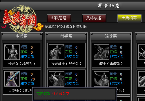 关于兵种方面,目前武将的擅长兵种被分为四大类,相比以前的版本少了很多,这样一来武将的培养将更加专业化,一个兵系的擅长、发挥最大威力将更加重要,而兵种的相克关系,现在直接在游戏里就可以查到了,非常的方便!
