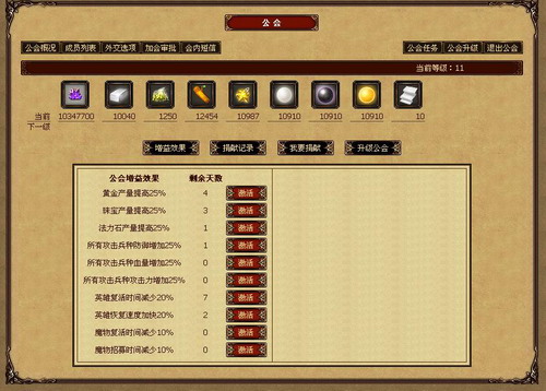 随着公会等级的提升,将给会内的玩家带来各种各样的增益效果。