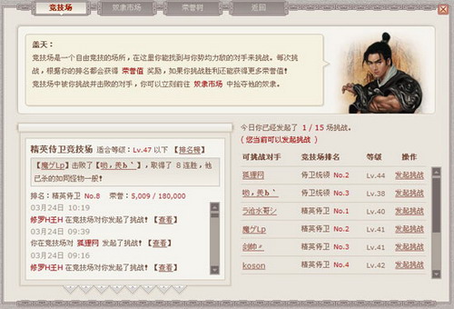 竞技场中,讲究高低胜负,当然这具有一定风险。若你选择作一名黑暗杀手刺杀其他玩家,首先观察对方等级高低,查看对方具体实力。当你有绝对把握时,可拉入对方进行强行PK,PK结束时会给予获胜方一定的荣誉奖励!并可通过一定的荣誉度换取规定物品,所以,PK前所需要做的视察工作必不可少,为避免不必要的损失,这一工作可是重中之重,可别做得不偿失的事!
