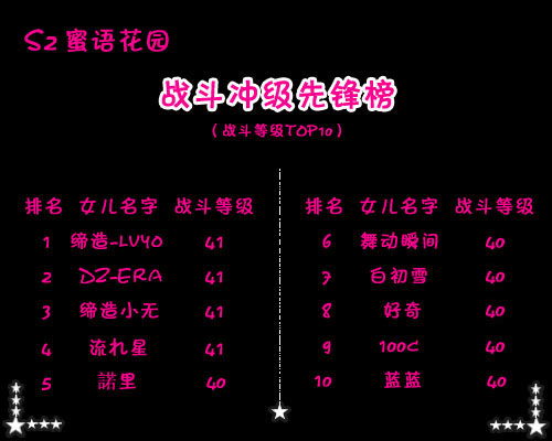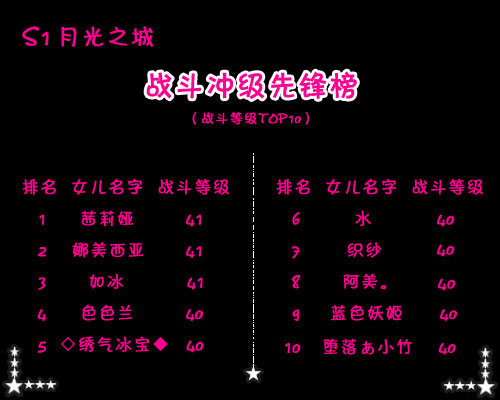 自上午10:00服务器正式开放,到下午15左右,短短五个小时的时间里,便有许多玩家的战斗等级达到或超过40级啦!下面,让我们一起来看一看S1月光之城、S2蜜语花园这两组服务器当中,绝对令人瞠目结舌的“战斗冲级先锋榜”吧!