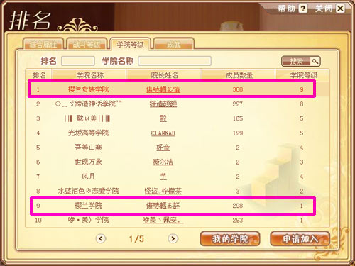 在MM炫美封测中,樱兰贵族学院绝对是一个奇迹——三万学院成员,超高的综合实力,无论哪一方面,在当时都是不可逾越的高度哦!如今,纯情内测甫一开始,樱兰便第一时间高调登场,落户S2蜜语花园服务器!再战MM世界,樱兰依然保持着所向披靡的势头,抢眼的风采比之封测阶段更可谓有过之而无不及!内测开启后创建的第一所学院、第一个成功招满人的学院、排行榜位居第一的学院……,最重要的是,就连樱兰学院的分院在开服首日都已经快达到满员状态了!学院等级排行TOP10,樱兰独占两席,实力果真不容小觑!