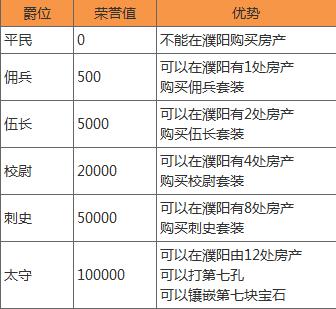 获得一定的爵位后,除了可以在争夺中城市拥有更多的资产,还可以购买荣誉装备以及升级特殊装备。荣誉值与爵位的对应关系为: