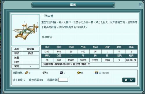 霹雳车,猛油火柜,三弓床弩,铁甲井阑是江南的器械单位,其中,霹雳车用于攻城,对人员造成的伤害减半,猛油火柜可以对低防御目标造成额外伤害。