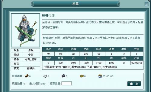 射术:提升使用弓,弩的兵种的攻击能力,同时也是训练这些兵种的前置条件。