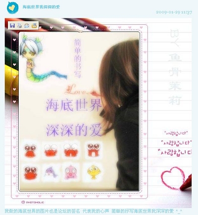 淡淡茉莉花是一个非常用心的玩家,经常会对海底世界提出一些自己的看法和建议,另外为海底世界设计LOGO及宣传画也是她乐此不疲的事情,下面的图片就可以表达她对于海底世界的感情哦!