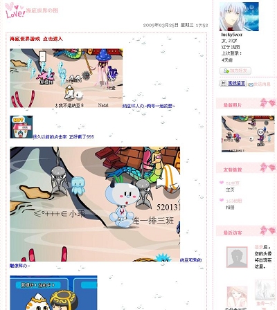 在另一位玩家的最美海底世界空间中,大量的海底世界图片所吸引,玩家夏模样惯以轻松诙谐的文字加上截图来表达生活在海底世界中的心情,夏模样的百度空间已有3年历史,特意为海底世界腾出大量的领土,难能可贵!