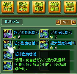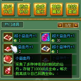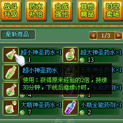 各种神圣药水是玩家们战斗升级的不二法宝,使用之后在一定时间内获得经验翻一倍,升级快一倍,规格从超小、小型、中型、大型一直到超大,双倍经验时间也相应从持续半小时一直到12小时不等。