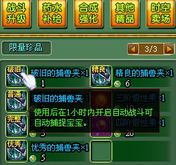 昆仑世界宠物宝宝可以说真的是娇贵极了,一碰必死,许多开了自动战斗系统的玩家对于每次来不及切换手动模式,而导致眼睁睁看着自己拍死宝宝的行为真是郁闷坏了。异宝斋限量出售的捕兽夹可以说给捕捉宝宝的玩家带来了好消息哦!使用之后可在一定时间内开启自动战斗自动捕捉宝宝,再也不用担心秒杀宝宝了!