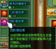 有些宠物总体看上去还不错,但是好像属性加错了点,需要的属性没优势,犹如鸡肋。悟性果的推出算是帮助这些鸡肋宠获得了新生,使用相应等级的悟性果,宠物在总潜能不变的情况下四项潜就能够进行再次随机分布,鸡肋变极品,极品成奇迹,轻松打造拉风宠物,想怎么玩就怎么玩!