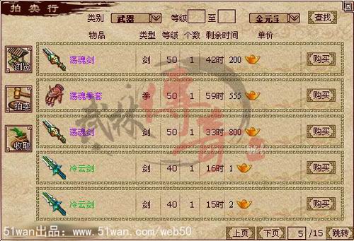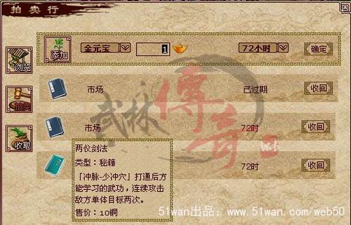 可能在很多游戏中,也都开始沿用了自WOW进入中国以来带来的特有拍卖行系统,但是一般都无法模仿到其精髓。而《武林传奇》,则正在向这个方向努力。游戏中,每个玩家可以同时拍卖3件道具(购买不限制),的确有点美中不足,但也为整个拍卖行市场,淘汰掉了很多次品。一般能留在拍卖行的道具,则必然会是精品,而这时候,就是考虑您对游戏服务器中整个市场的能力调查行为了。了解了市场行情,自然而然就可以进行一些买入和卖出。一般情况下,都是直接将打BOSS获得的极品石头、装备、道具等物品,直接挂在了拍卖行出售。出售的货币,玩家可以自己选择为银币或者是元宝,当然,得有人肯买才成喔。(温馨小提示:如果您购买了道具,请记得在拍卖行收取)