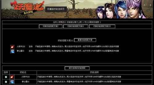 在以前版本的妖魔道中,玩家只能学习七个技能,如果想学习新的技能就需要遗忘以前的技能,而在新的版本中这将成为历史,玩家可以通过新功能技能树,随意搭配自己的技能,随意组合来满足自己的不同的需求,而且所有技能将不需要再重新学习。