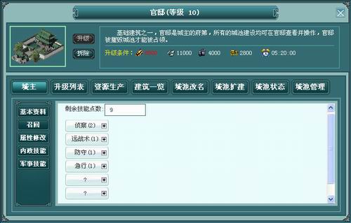 城主的军事技能“侦察”可以降低侦察兵被发现的几率。在科技不占优势的情况下,为了提高侦察效果,不得不多派遣侦察兵,此时,如果城主在派遣侦察兵的城池,并且修习了侦察技能,则可以有效的减少侦察兵被发现的几率。
