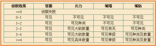 根据官方的说话,在研究院升级的侦察术占主导地位,侦察方与被侦察方会根据科技等级差异形成一个数值,这个数值决定了侦察效果。参考官方论坛的帖子,侦察效果如下: