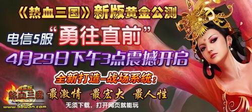 56玩《热血三国》开放以来,一直保持较快的发展速度。随着玩家数量的飞速提升,目前56玩《热血三国》所开启的服务器仍然能保持火爆人气。56玩《热血三国》能够一路走到今天,是绝对离不开广大的玩家的支持与厚爱的。为了回报大家一直以来对56玩《热血三国》的喜爱,为了让玩家们更好的体验游戏,将于4月 29 日下午3点整推出最新新版1.1.11版本新服“勇往直前”火爆公测!同时我们还为大家准备多重精彩活动。