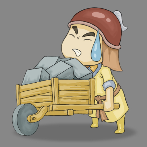 说是筑城队,可是怎么只有一个人,囧。看那哥累的,一个人推着一车砖头去盖新城,