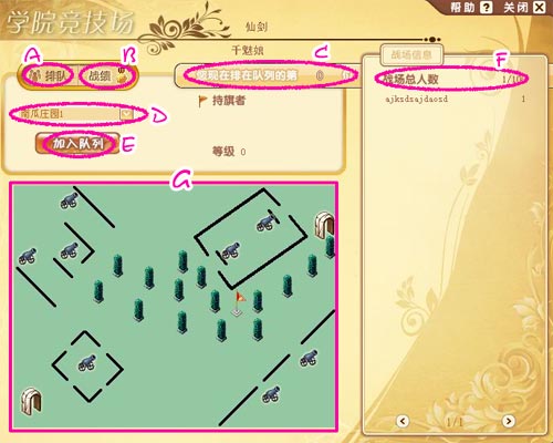 E、“加入队列”按钮——选中要加入的学院战场之后,点击“加入队列”按钮,如果战场内的玩家尚未达到人数上限,则弹出询问你是否立即进入战场的对话框;如果,战场内的玩家已达到人数上限,则C处显示你当前排在每几位。