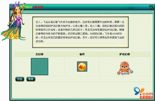 主幻兽的等级将直接决定飞仙成功的机率,随着幻兽等级的提高,其修为也在不断地提升,这时进行飞仙的成功率也会大大提高,等到幻兽50级的时候,修为已入仙境,升仙机率将为100%,您千万不可错过飞仙的机会哦!