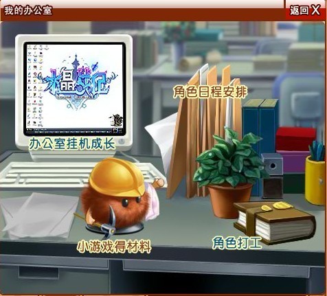 办公休闲系统包括“办公室挂机成长”、“小游戏得材料”、“角色日程安排”、“角色打工”四个选项。(V1.0版本只开放了办公室挂机成长功能,其他功能会陆续开放)