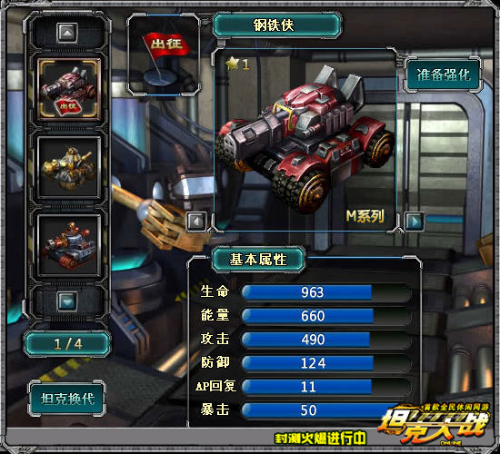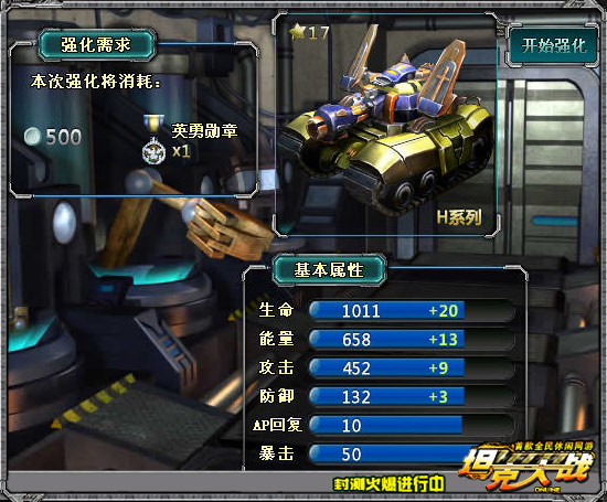 坦克大战online》引入了养成要素,让坦克多了几分灵气,能够像宠物一样拥有属性点养成,不断地生长变强。从此,你的坦克不再是机械的钢铁工具了,而是技术含量极高的人工智能机器。要让坦克生长变强的方法就是强化换代,之前已经介绍过换代,现在就一起来了解下强化吧!