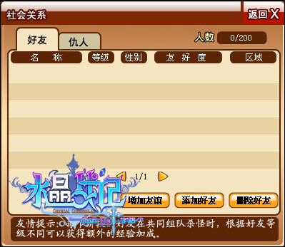 水晶玩家尽展魅力成为炙手可热的社交新星!届时玩家们在游戏中的每分每秒里,都可以通过互动选择朋友增进感情,社交关系分为好友关系和仇人关系,不管是哪种关系,玩家都将感受到游戏超强的互动性,为你的交友提供更广阔的空间。成为好友不仅可以结婚,而且在组队战斗时会得到额外的经验奖励!仇人之间也可以互通信息,想和解还是一较高下,就看你喜好了。《水晶战记》更加有乐趣,玩家变身众人为追捧的对象!