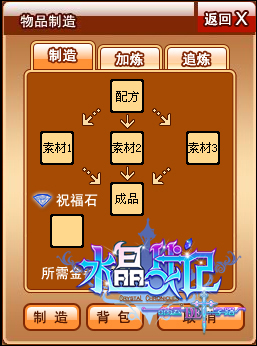 制造系统充分启动玩家DIY热情,想做什么就做什么!玩家只需通过杀怪、任务就可获得装备配方和锻造材料,当收集足够的锻造材料,就可以进行锻造。利用自己的巧手,很快便能拿到自己心仪已久的装备。在锻造装备成功的同时,玩家更可将名字镌刻在装备上。世上仅此一件的专属装备,水晶玩家值得拥有!