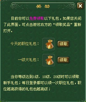 只要您成为《幻境2》的玩家,当您进入幻境即可获得1级职位礼包(红色药剂(+200)×5、蓝色药剂(+200)×5、礼券×10);达到10级就可获得 圣灵石×5、吉运石×1、礼券×50;达到20级可获得精力恢复丹×5、钥匙×5、大还丹×1、礼券×100。此后只要您每天登陆《幻境2》跟据您的职位都可获得一份惊喜的登陆大礼包。职位越高,系统为您送上的道具价值将会越高。还等什么?赶紧开始幻境之旅吧!(注:礼包可立即打开。)