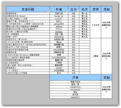 10名玩家评审更是尽职尽责,虽然这次评审真是难倒了他们.在这次活动中,显然最后的激烈程度超出了玩家评审们所能想象的范畴,10名评审中更是有3名兴奋的过了头,令人遗憾的没有赶上最终的评审期.不过这24篇文章对于其余的评审来说,看来真是痛并快乐着.尽管如此,评审们也是根据个人标准进行最终的选择,也为本次征文活动画上了圆满的句号.