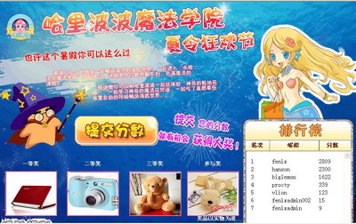 2009年6月15日~8月30日期间,海底世界还将推出哈里波波魔法系列小游戏全球排名大奖活动,更有机会赢得笔记本电脑大奖!是不是很心动呢?而参与方式非常简单,只要您将在任何一家小游戏网站玩的分数提交到指定页面(http://www.club-fish.com/event/magic/),就有机会赢取笔记本大奖!
