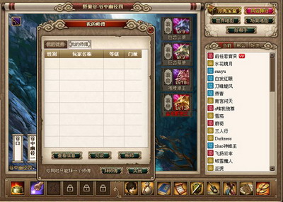 作为RPG类的武侠题材网页游戏,师徒系统可以说是必不可少的。各大门派武艺德行的师徒传承乃是中国武侠中至关重要的一个元素。在《武侠风云》中,30级一下的玩家都可以进行拜师,而到了30级以后,玩家即可以进行收徒。师徒可以自由建立或断绝关系,同时师徒可以共同进行师徒任务。