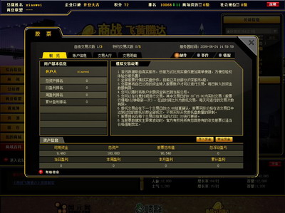 全球首款免费创业网页游戏《商战飞黄腾达》高度拟真的商业模式,配合股票系统的推出,将成为你创业之路所迈出的第一步。《商战飞黄腾达》不仅能让玩家体验到游戏中精细且经典的画面,而且更多的是感受一种浓郁的商业氛围。我们不要只做一名优秀的创业者,我们应该往更高层次发展,做一名像“巴菲特”般的传奇人物,或者是一名成功的投资商人,不断的获取最大的利润,如何获取?首先得增大自己的投资压力,如何增大?《商战飞黄腾达》股票系统将是你最理想的课堂。