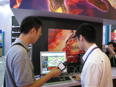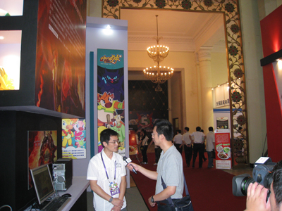 作为国内用户量最大的网页游戏,乐港旗下游戏《热血三国》在展会现场不仅吸引了众多的游戏体验者,也引起了不少传统电视媒体的关注。图为乐港公司副总裁赵暄先生就网页游戏企业的高速发展势头接受**的采访。