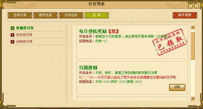 刚注册游戏,FLASH教程结束之后,每次登陆游戏便会弹出【任务列表】,对新服里刚当山寨大王的玩家朋友,老施我就对【任务列表】做一个详细介绍。