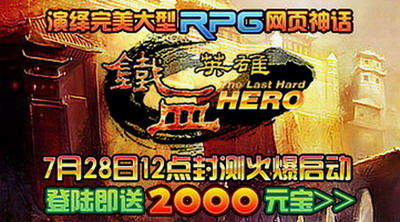 万众期待的大型RPG网页游戏《铁血英雄》将于7月28日中午12点正式开启铁血封测之旅。扑朔迷离的华夏大陆,战火纷飞的神州世界,一段英雄诗史等待你来谱写新的篇章。作为神秘来客之一的你,是称雄天下的一代霸主?是名风华绝代的盖世武将?是名留青史的绝世智者?是富甲天下的一代巨商?进入《铁血英雄》世界,回到被改写的东汉末年,神秘失踪的名将、虎视眈眈的外族、玄幻莫测的山寨、偏离轨迹的历史……一切都等待你来铁血英雄的世界里探索、改变与创造!一切的一切,尽在《铁血英雄》!