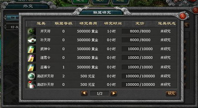 新版本中还将开放联盟研究功能让联盟的玩家获得更大的利益.联盟研究的研究对象将会以宝物的形式出现.并且研究的宝物的种类将和联盟等级直接挂钩.一个联盟只有盟主才能决定研究哪个宝物研究费用从联盟仓库中扣除.并且研究完成以后只能向同联盟的玩家发售,发售的价格由盟主根据系统给出的指导价格自行决定.