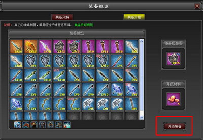 再点击此窗口顶部的“装备升级”,选择好需要升级的装备和材料即可。