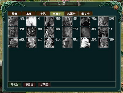 怪物卡。在战斗中被击败的怪物将会被自动封印,封印有一定的成功率。怪物卡按照对应的怪物类型不同分成异化怪、虫豸怪、水族怪三类。(怪物类型具体参考官网-游戏资料-特色系统-野怪系统)。