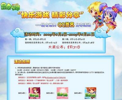 美好正在进行,惊喜总在酝酿,有爱《昆仑世界》等你加入!QQ签名分享活动?第二期马上就要开始啦!8月17日—8月21日,加入官方指定QQ群即可参与签名分享活动,获得真金白银也买不到的极品好礼,赶快来参加吧!具体活动详情,请随时关注官网最新动态!