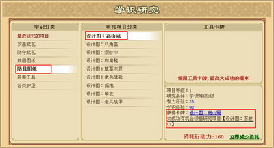 从此,学识不再是枯燥无味的花时间,等待一些只价值几十铜的廉价卡片了。您可以针对性的研究某本武艺书,或者领悟到新的高级武艺。玩家可以有针对性的选择想要进行的学识项目,例如武艺、图纸、防具、工具,每项都对应有专门的学识科目,从此,学习成了一种乐趣,成了快速收获理想的途径。