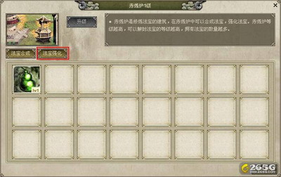 ①进入赤炼炉后,选择“法宝强化”功能,即可进入法宝选择界面。