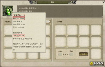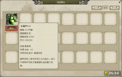 法宝“玉葫芦”强化之后,法宝名字上也携带了法宝强化的等级“玉葫芦LV1+1”,精魄属性由原来的53上升到57,法宝的效果也从减少对方最强目标42点生命上升到减少对方最强目标46点生命。