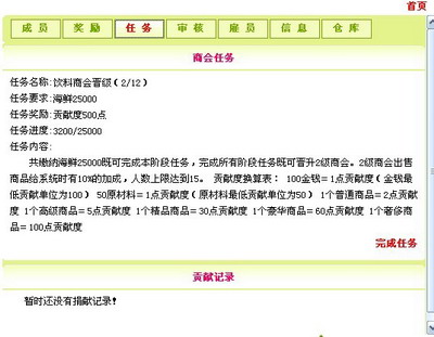 玩家在加入公会后,将可以接受到可以商会任务。每人每天能完成一次,每次完成后都能得到金币和商品奖励,并且为公会提高一定的贡献度。