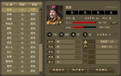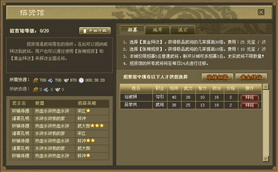 在武将招募列表中,我们可以看到默认的2名将领的姓名、职业、属性、价格,如果你觉得这两名将领有满意的,可以点击后面的“败将”按钮即可招募麾下!如果对这两名都不满意,那么需要等到每天24时之后,此列表才会再次刷新。当然,你还可以使用“张榜招贤”或者“黄金拜访”功能键,花费一定元宝主动刷新列表。此时将会出现10名将领供你选择。