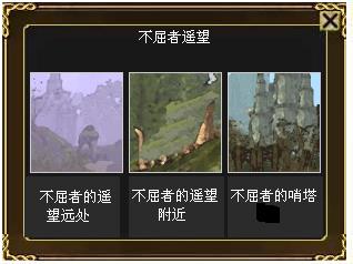 不屈者遥望位于奥古斯都平原中部丘陵地带,在平原地带来说占据了整个地区的制高点。这里可以看到不屈者遥望远处遥望塔的狼烟冉冉,多年来不知“屈服”的人们一直与王国的骑士团战斗,这是他们战场的边缘。“不屈者”在不屈者遥望附近巡逻,他们充满敌意,无论是对骑士,还是对冒险者。每一位冒险者来到这里时都必须提醒自己“握紧手中的武器”。不屈者的哨塔曾经被用来抵御外族的侵略,现在被用来抵御同族的进攻。