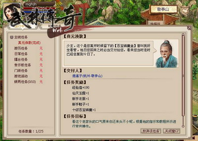 《武林传奇2》的任务系统中会详细的提示玩家可以接收的任务、正在进行的任务以及如何完成任务的提示和相应的任务奖励。NPC的头像中标注问号,表示可以在此处接受任务,而NPC的头像中标注叹号,表示可以在此处交付任务。同时,任务系统中还有每日任务供玩家选择。