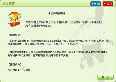 活动杯赛则是由玩家交报名费参加,每16人开始一大组比赛,16人分成4个小组进行单循环小组赛,3轮后淘汰每组后2名,剩下8人两两配对进行单轮淘汰。