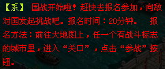 2)地点:其他国家与本国连接的城市中,进入关口后点【参战】按钮,即可报名,等级不到40级不能报名国战;